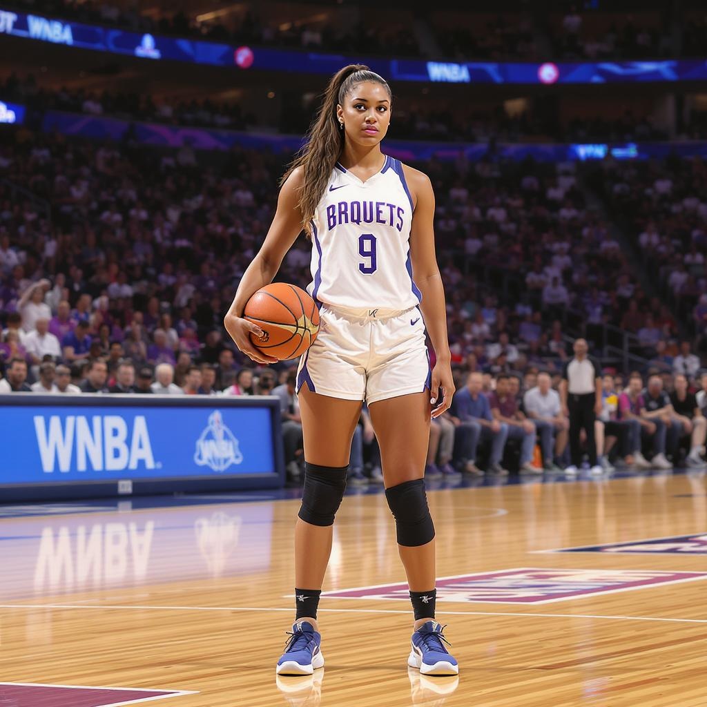 Intricately detailed image, 64k, featuring a girl with best long brown hair in a high ponytail, standing confidently on a basketball court. She is wearing sporty basketball attire, complete with a team logo and player number. Her sneakers grip the polished court floor of a stadium, surrounded by an audience of eager spectators filling the stands. The girl, with medium build and a focused expression, grips a basketball under her right arm. The setting is buzzing with energy, highlighting the vibrant atmosphere of a WNBA game. The depiction avoids fantastical elements, focusing on a realistic sports scene.