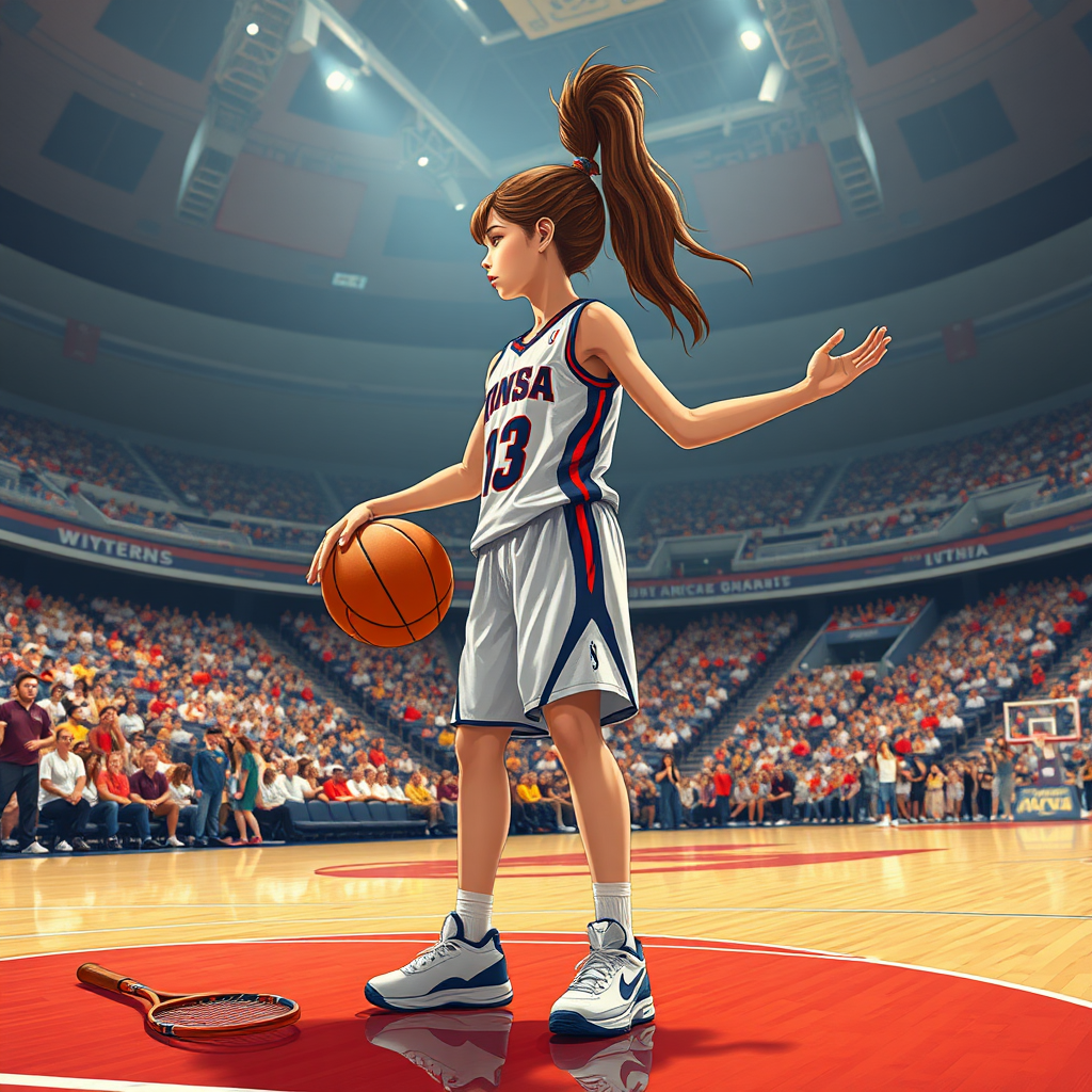 Intricately detailed image of a girl with long brown hair styled in a high ponytail, standing confidently on a basketball court. She's wearing sportswear and a basketball uniform with a team logo and player number. Her sneakers grip the court as she holds a basketball, poised to make a play. The indoor stadium is filled with spectators in the stands, their excitement palpable. Despite the vibrant energy, there's an air of surrealism with extra arms and legs present, adding a unique twist to her silhouette. The scene captures the essence of a WNBA game, but with a fantastical element, like a slightly deformed tennis racket resting at the edge of the court, hinting at a dreamlike atmosphere.