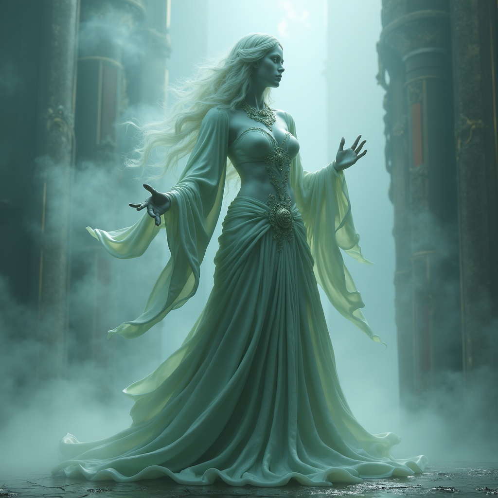 Intricately detailed marble and jade sculpture of a female necromancer, enveloped in ethereal volumetric fog, crafted with hyperrealism. The scene is breathtakingly realistic, as if rendered in Unreal Engine, showcasing finely tuned, ultra-detailed elements. The cyberpunk-inspired background adds a futuristic edge, enhanced by cinematic lighting that casts dramatic shadows and highlights. The environment is stunning, blending a wide-angle CGI aesthetic with hyperrealism. This 3D masterpiece, reminiscent of a sculpted doll, is rendered with octane precision, while the artistic style pays homage to anime and illustration techniques. The digital painting is so meticulous, capturing every nuance in a high-resolution image devoid of artifacts, and emphasizing flawless anatomy and proportions. The sculpture exudes an aura of elegance and mystique, harmoniously balancing fantasy and realism without any distortion or errors in representation.