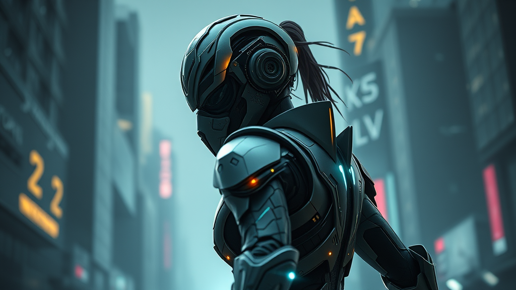 Intricately detailed mask, female figure in advanced exosuit, dynamic motion, emphasizing a hip view, sci-fi aesthetics, hawk-inspired design, warframe influence, shadowy environment, elaborate details, rogue-like slender young figure, battle armor, futuristic metropolis backdrop, exceptional image clarity in 8k, sleek teflon texture, articulated armor, octane-rendered, vibrant energy lights, neon accents, maximum detail and fine precision, matte and smooth surfaces, hyper-realistic, sophisticated volumetric lighting, immersive 3D realism, ultra-high definition.