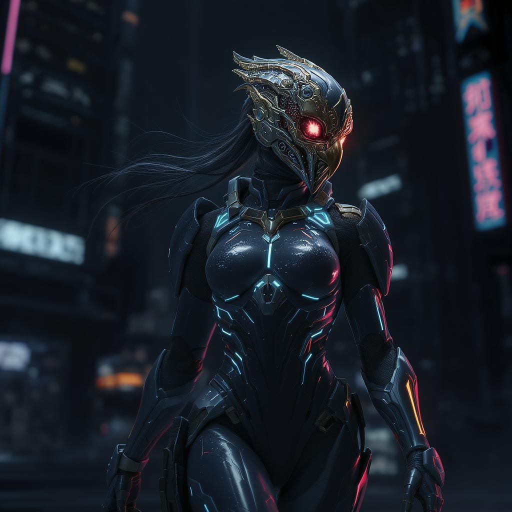 Intricately detailed mask on a female figure in a sleek exo suit, captured in motion from a dynamic hip angle, encapsulating an intense sci-fi aesthetic. With a hawk and warframe influence, she stands in a dark, rogue-like ambiance. The slender young figure is clad in a beautifully intricate battle armor, set against the backdrop of a sprawling futuristic city. The image boasts astonishing 8k quality, where the segmented armor exhibits a Teflon-smooth surface, adorned with radiant energy lights and piercing neon accents. The scene is optimized with octane rendering, delivering maximum detail and realism. The interplay of complex volume lighting enhances the 3D depth, while matt and smooth surfaces refine the overall composition, ensuring ultra-high definition with unparalleled fine detail.