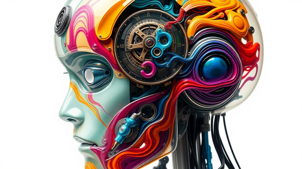 Intricately detailed robot head with an exposed clockwork mechanism, showcasing a vibrant blend of colorful liquids swirling within its transparent shell, conveying a range of expressive, abstract emotions. The design is influenced by contemporary art trends, capturing a futuristic essence reminiscent of Ryohei Hase's style, highlighted by seamless integration of mechanical precision and fluid artistry. Trending on ArtStation, this piece reimagines robotic elegance with a touch of avant-garde innovation.