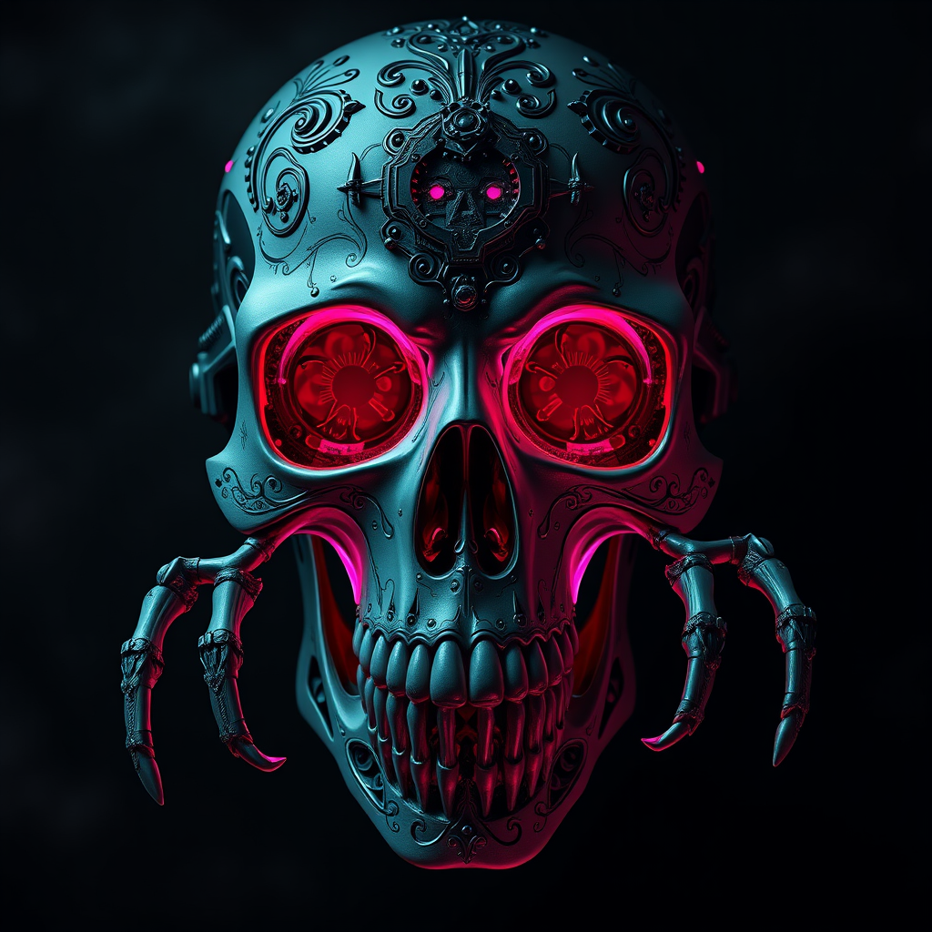 Intricately detailed skull featuring mechanical components with vivid pink luminescent fluid pouring from its eye sockets, enveloped in a shadowy ambiance. The design is enriched with complex, ornate filigree patterns, presented in razor-sharp focus and extraordinary detail. Crafted in 8k UHD HDR quality, this concept features a surreal twist: duplicated, mutated elements including a cloned visage with a crossed gaze, elongated neck, and extra digits on distorted hands. These peculiarities are contrasted with the skull's mechanical elegance, capturing a hauntingly beautiful juxtaposition. Avoid any out-of-frame blurs, low resolution, or artifacts like watermarks and logos to maintain the artwork's pristine quality.