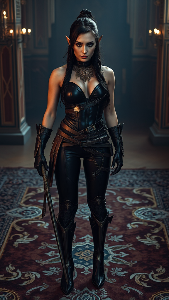 Intricately detailed warrior woman with striking, luminous eyes posed gracefully in full growth wearing a form-fitting latex ensemble; standing on a lavish carpet crafted from leather and silver, captured in a full-body composition. The scene is dimly lit, showcasing ultra-realistic, photorealistic, and hyper-detailed qualities. Photographed using a Leica SL2 with an f/5.6, 105mm lens, reflecting the artistic influences of Irving Penn and Annie Leibovitz, and expertly retouched for subtle elegance and depth. The composition maintains a harmonious balance with an aspect ratio of 1:2, evoking a sense of timeless allure and power.