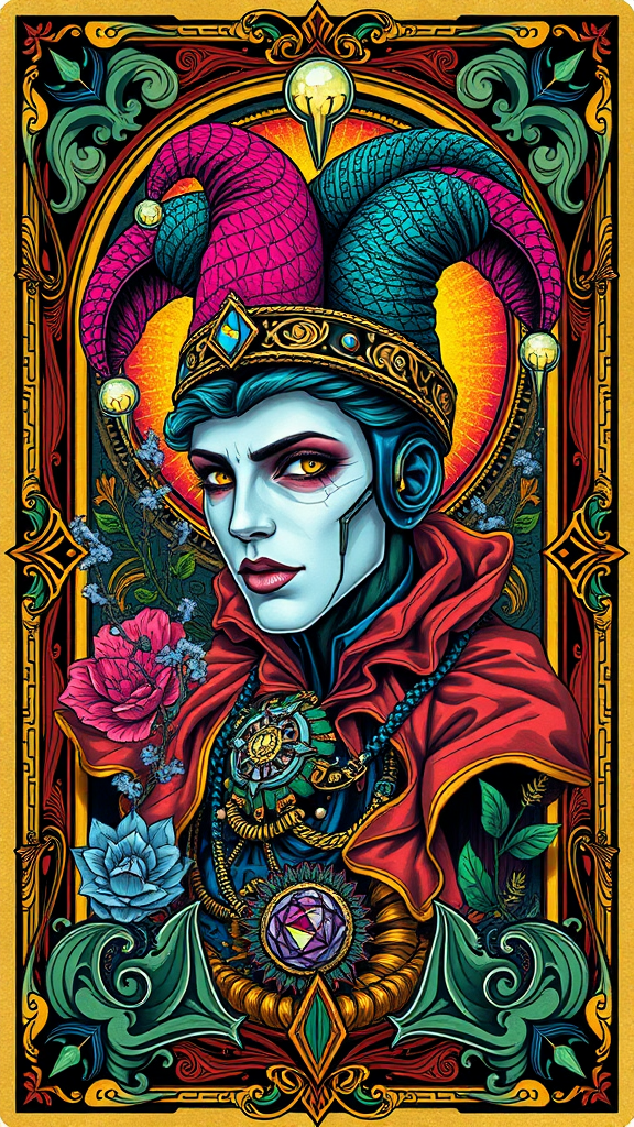 Intricately framed tarot card featuring a portrait of a cyberpunk figure adorned with a jester hat, styled in Art Nouveau with vibrant embellishments, showcasing insanely detailed components. The design embodies high-definition digital concept art, highlighting an elaborately detailed frame and vibrant colors to convey a futuristic, whimsical essence. 4K resolution emphasizes the meticulous focus on detail, maintaining the enchanting allure of a classic tarot card infused with modern cyberpunk aesthetics.