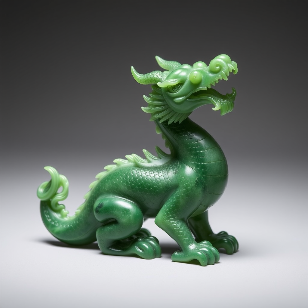 Intricately sculpted jade celestial Chinese dragon, intelligent expression, expertly hand-carved from rich green nephrite jade, gallery-like photograph, minimalist composition, ethereal presence, elegant details, artistic craftsmanship.