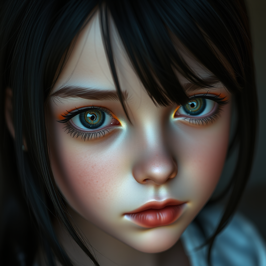 Intriguing dark-haired girl gazing at the viewer, portrait style, high-definition photograph, meticulously detailed skin, lifelike realism, 8k resolution, exceptionally detailed, full-length frame, captivating piercings, soft and diffused lighting, shallow depth of field, strikingly sharp focus, hyper-realistic, cinematic CGI lighting, 3D-rendered, doll-like features, utilizing octane rendering, intentionally includes visual imperfections such as low resolution, text errors, cropping, and various quality issues, including jpeg artifacts, unattractive elements, duplicates, morbid tones, and deformation. Features may be out of frame with irregular anatomy, blurred sections, poor proportions, mutations, disfigurement, missing or extra limbs, and other unconventional attributes for creative emphasis while maintaining the core essence.