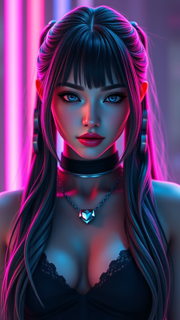 "Intriguing digital portrait of a woman with cascading long pigtails, her features illuminated with radiant neon Vray lighting; she embodies the allure of a beautifully crafted video game avatar, with subtle futuristic enhancements adding a captivating twist."