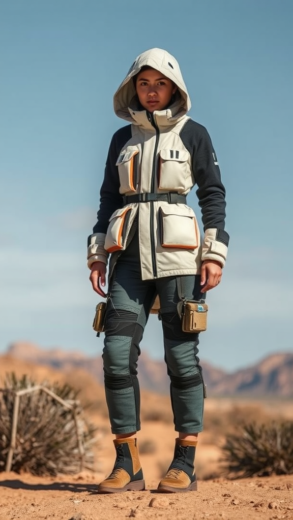 "Introducing a groundbreaking fashion line, 'Nomad Horizon,' which envisions a future where technology and nomadic living harmoniously coexist. This collection features garments that blend sleek, futuristic aesthetics with the rugged versatility of nomadic culture. The designs emphasize bold silhouettes that stand out in any environment, while maintaining a focus on functional adaptability. Innovative materials such as self-healing fabrics, solar-powered textiles, and lightweight composites provide practicality for a mobile lifestyle. Multi-functional layers, expandable storage, and modular components allow wearers to customize their outfits according to changing needs and landscapes. This line caters to the dynamic spirit of adventurers navigating a technologically advanced world, offering pieces that are as stylish as they are practical."