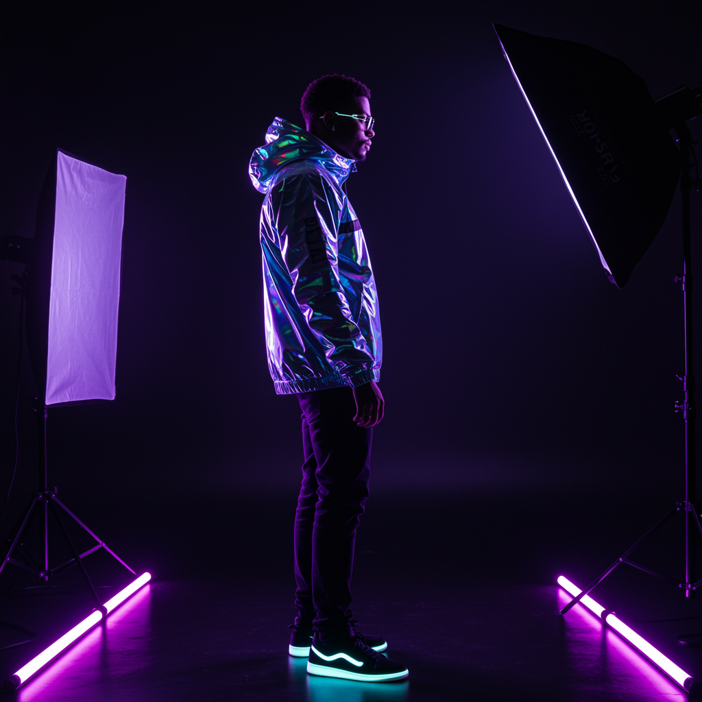 Invoking the essence of fashion photography, a charismatic male model is captured through the refined lens of a Canon EOS R3 with a 50mm f/1.2 RF, settings fine-tuned to f/2.8, 1/160s, and ISO 1600. The scene showcases a striking streetwear vibe with a holographic twist on apparel, while luminescent sneaker soles draw the eye. The mystique of a dark backdrop is enriched by deep purple ambient lighting, complemented by a sophisticated studio arrangement featuring two LED strip lights at floor level and a 5600K overhead softbox. Embodying a cyberpunk aesthetic, the model adopts a side profile pose, casting a compelling silhouette amidst dramatic contrasts. Achieving ultra-sharp realism, the image boasts a 48K resolution teeming with rich detail, enhanced by a gradient neon violet hue threading through the scene, harmonized with chaos 16 and stylized to 300, invoking a raw, personalized touch inspired by c84qxg1 in version 6.1's immersive world.