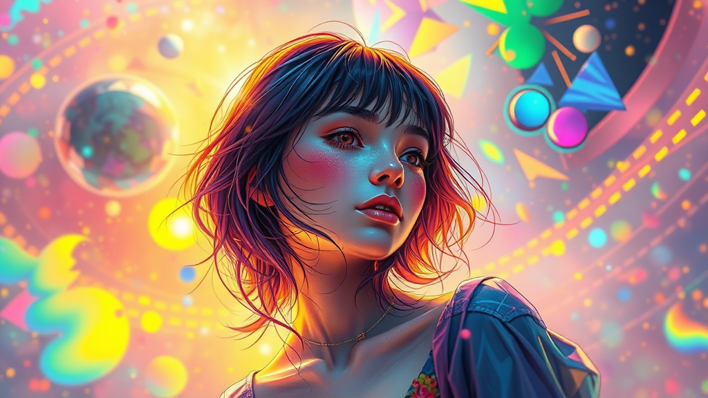 Iridescent Cosmic Fantasy, Suprematism meets Pop Art, a hyper-detailed scene featuring a girl in a kaleidoscope of colors. Inspired by the styles of Ko Young Hoon and Kilian Eng, the composition uses airbrush techniques, presenting a mesmerizing isometric 3D perspective. It resembles a stunning watercolor piece, blending realistic and fine art elements with colorful, futuristic details. Bathed in the golden hour's light, the scene glows with a vibrant, surreal beauty. Digital painting meets hyperrealism, crafted with care in an octane render style that is trending on ArtStation, captured in breathtaking 16k UHD HDR. Beyond reality, it evokes a whimsical dreamscape, harnessing fast-paced modern techniques while celebrating rich cultural influences.