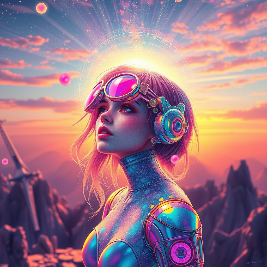 Iridescent Cosmic Girl, inspired by Supremacism and pop art, featuring hyper-detailed, realistic elements. A vibrant scene depicting a singular girl crafted by artists like Ko Young Hoon and Kilian Eng, using airbrush techniques for an isometric 3D effect. Presented as a beautiful watercolor painting and fine art piece, it explores a colorful, futuristic narrative with detailed patterns. Set during the golden hour with iridescent hues, this digital painting blends hyperrealism with surrealism, utilizing octane render technology to achieve a trending ArtStation look. Captured in 16k UHD HDR quality, it creatively avoids Asian-Less-Neg, FastNegativeV2, UnrealisticDream, and BadDream aesthetics.