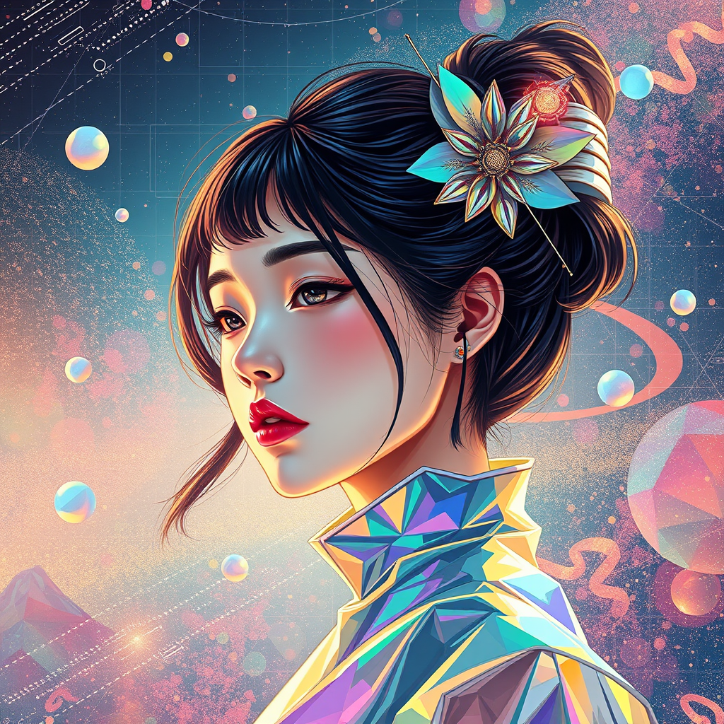 Iridescent Illustration, Neo-Suprematism, modern pop art, intricately detailed, one girl, inspired by the styles of Ko Young Hoon and Kilian Eng, airbrush technique, isometric 3D composition, exquisite watercolor aesthetic, lifelike fine art, bursting with color, cosmic and futuristic essence, intricately designed, golden hour ambiance, shimmering, vibrant, digital artwork, hyperrealism meets surrealism, octane render finish, popular on ArtStation, 16k resolution, UHD, HDR quality, Asian influences subtly woven, ethereal dreamlike quality, embracing the unreal, imaginative wonder.