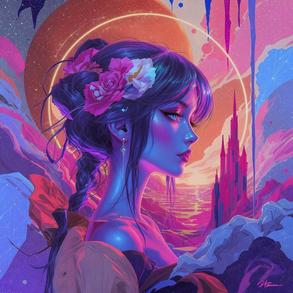 Iridescent masterpiece blending Supremacism and pop art, featuring a hyper-detailed scene with a single girl in a style inspired by Ko Young Hoon and Kilian Eng. The artwork employs airbrush techniques with isometric 3D elements, emulating a beautiful watercolor painting. It combines realism and fine art with a cosmic, colorful, and futuristic aesthetic. The scene captures the golden hour's glow with vibrant, iridescent tones, portrayed through a digital painting approach. Elements of hyperrealism and surrealism are woven in using octane render technology, providing an artwork that is trending on ArtStation. Rendered in 16k UHD HDR, it presents an otherworldly dreamscape enhanced by Asian-Less-Neg, FastNegativeV2, UnrealisticDream, and BadDream influences.