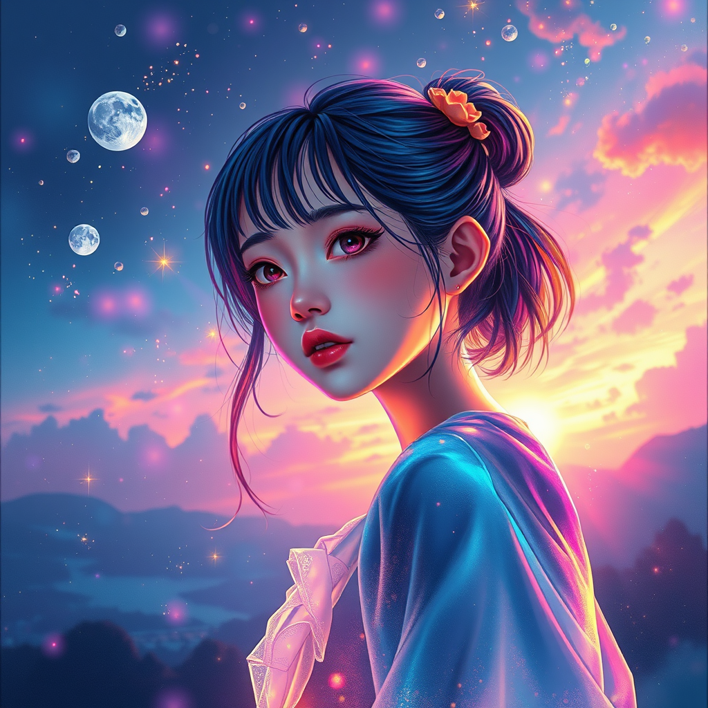 Iridescent painting featuring a single girl, infused with elements of Supremacism and pop art. The style is a fusion of hyper-detailed techniques inspired by artists like Ko Young Hoon and Kilian Eng, using airbrush effects. The composition is an isometric 3D scene depicted as a beautiful watercolor painting that's both realistic and surreal. It embodies fine art with a vibrant, cosmic, and futuristic aura, capturing the magic of the golden hour. The painting is iridescent and colorful, rendered in hyperrealism and surrealism, utilizing octane render techniques. The imagery is trending on ArtStation, presented in 16k, UHD, and HDR quality, emphasizing an Asian influence, while avoiding less-desirable themes with FastNegativeV2, UnrealisticDream, and BadDream considerations.