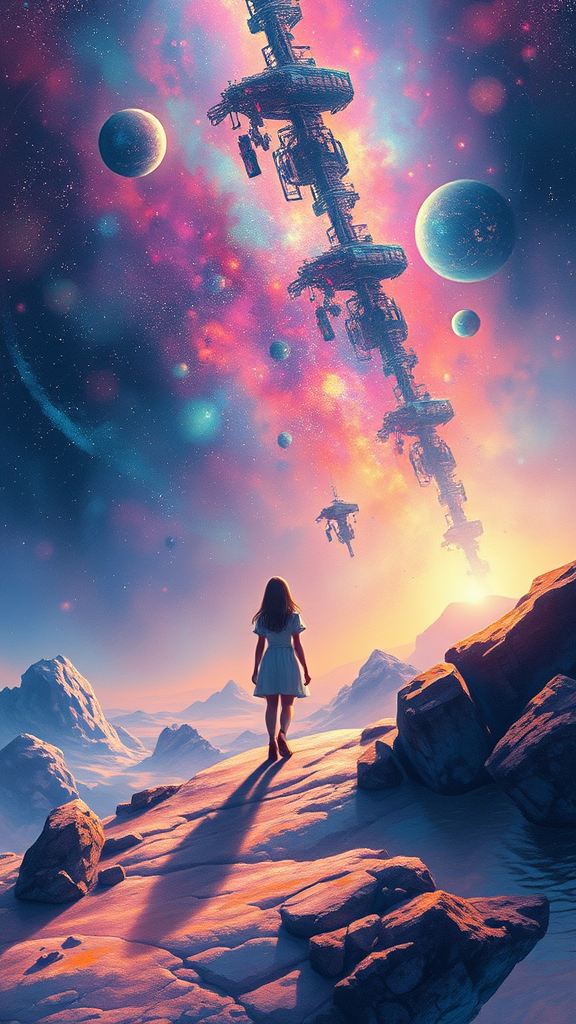 Iridescent Painting of a lone girl exploring a cosmic landscape, inspired by Supremacism, pop art, and hyper-detailed artistry. The scene is rendered in the distinct styles of Ko Young Hoon and Kilian Eng, utilizing airbrush techniques and isometric 3D perspectives. This beautiful watercolor painting captures a realistic and fine art aesthetic, bursting with vibrant colors that evoke a futuristic and dream-like atmosphere. Set during the golden hour, the scene glows with an ethereal, iridescent quality, combining elements of hyperrealism and surrealism. Created using digital painting and octane render technology, this piece is trending on ArtStation for its 16k UHD HDR quality, capturing the intricate details and cosmic grandeur of the scene. The painting remains free of Asian stereotypes and avoids the pitfalls of unrealistic or bad dream-like imagery.