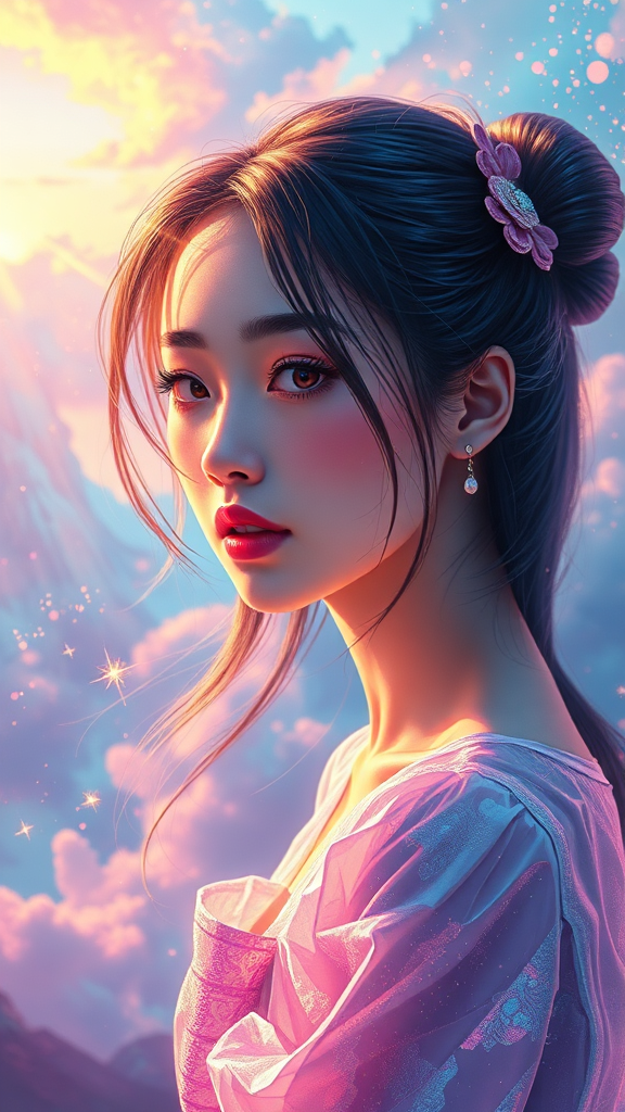 Iridescent Painting, Supremacism, pop art, hyper-detailed, 1 girl, inspired by ko young hoon + kilian eng, airbrush technique, isometric 3d, a beautiful watercolor painting, realistic and fine art, colorful with cosmic and futuristic elements, detailed during the golden hour, vibrant and iridescent, digital painting in hyperrealism and surrealism, rendered with octane, trending on ArtStation, in 16k resolution, UHD, HDR, with elements of Asian artistic influence, incorporating themes of Unrealistic Dreams and Bad Dreams, reimagined for a dreamlike yet realistic composition.