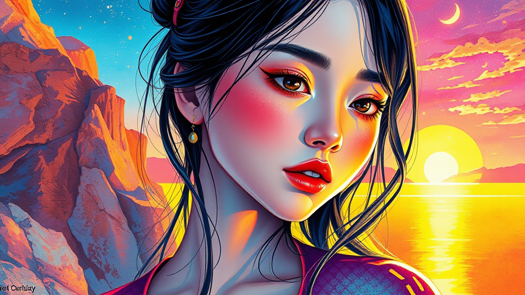 Iridescent Painting, Suprematism influence, pop art style, hyper-detailed; features 1 girl, inspired by artists Ko Young Hoon and Kilian Eng; airbrush technique with isometric 3D perspective. A beautiful watercolor painting merging realism and fine art, showcasing vibrant, cosmic, and futuristic elements. Detailed depiction at golden hour, with an iridescent and colorful palette, blending digital painting techniques. Combines hyperrealism and surrealism, rendered with octane, trending on ArtStation, captured in 16k UHD HDR. Central focus on Asian art aesthetics, drifting into a dreamy, surreal narrative with a hint of abstract unpredictability.