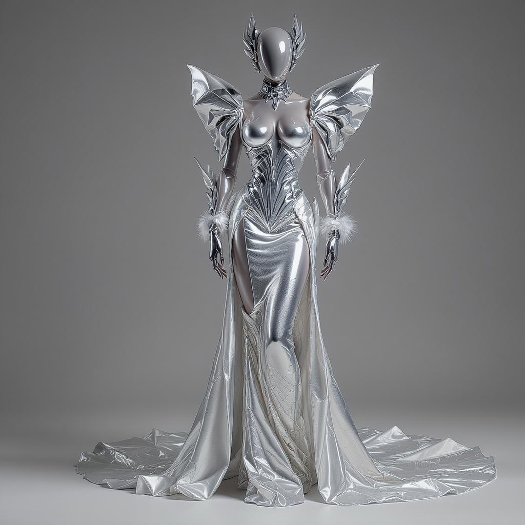 Iris van Harper inspired avant-garde metallic couture gown, futuristic elegance, full-length design, 3D concept art, ultra-high-definition render, 8k resolution, hyperrealistic detail, studio lighting, fashion photography aesthetic, with a touch of ethereal luminescence and sleek, aerodynamic contours.