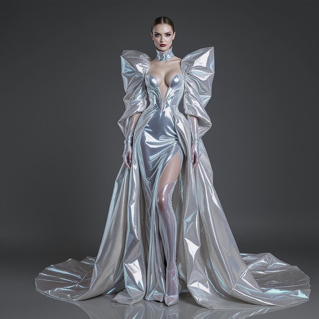 iris van harper retrofuturistic metallic couture gown, head-to-toe ensemble, conceptual art, sleek holographic textures, ultra-high definition, hyperrealistic 3d visualization, professional studio lighting, editorial fashion shot