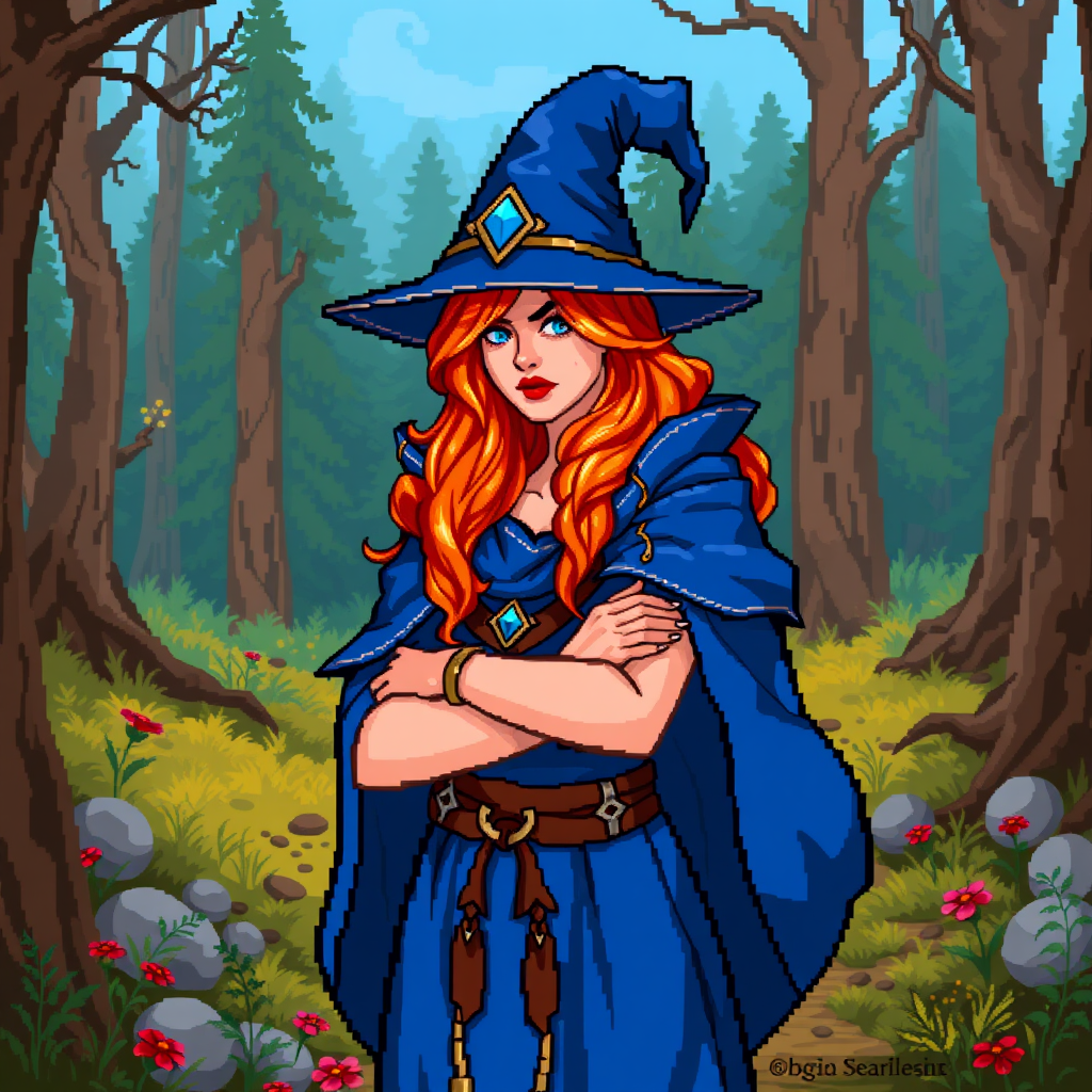 Irked sorceress standing in woodland, arms folded, adorned with a sapphire pointy hat, fiery orange hair, and a cobalt cape over a matching blue robe, set in 64-bit pixel art style, surrounded by mystical forest elements.