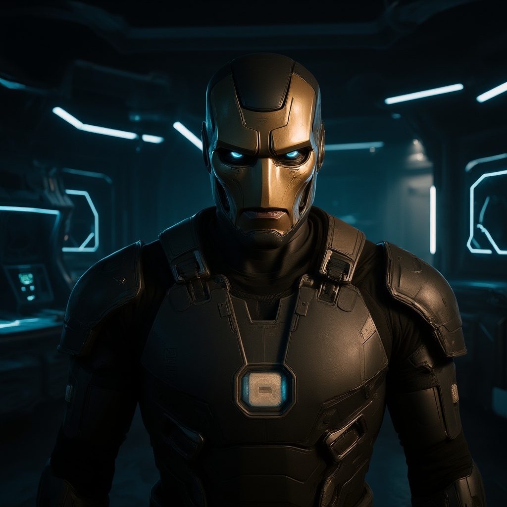 View this AI-generated image featuring iron man photorealistic future scene embodying futurism and advanced mechanics iron man in his helmet standing tall in his high tech studio eyes locked on the viewer full portrait view cinematic film frame dynamic lighting capturing high detail and realism natu