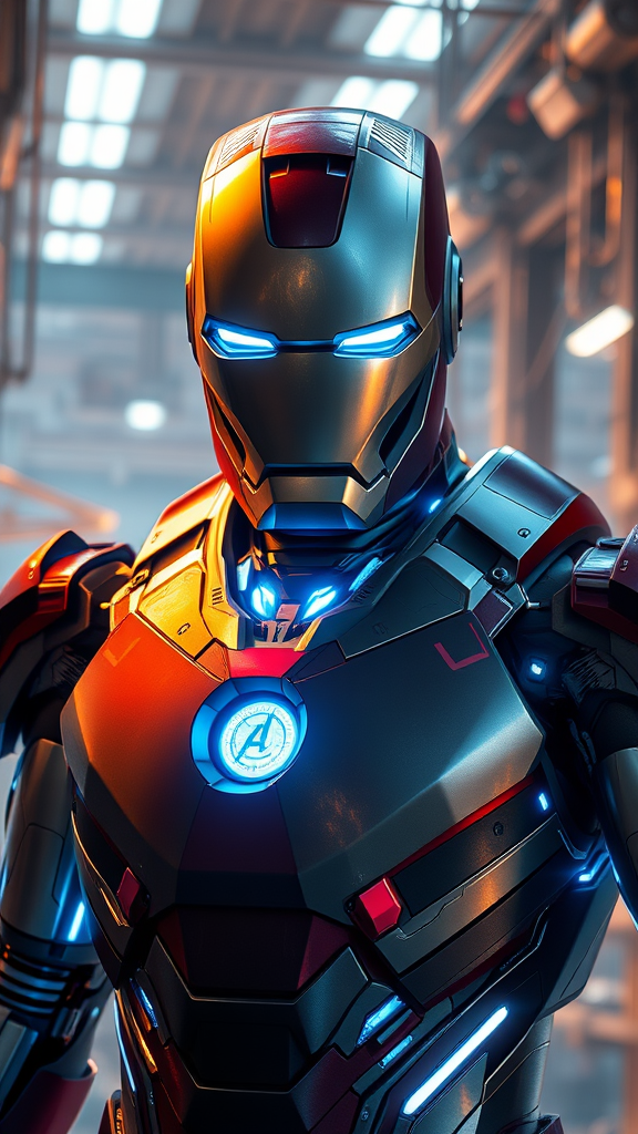 Iron man stands in robust growth within a sprawling, futuristic technological laboratory, his entire figure heightening his technological prowess, dressed in his signature suit, adorned with glowing blue accents, a mirror-like reflective visor partially darkened to reveal piercing eyes that stare directly at the camera within the confines of a warmly lit film frame reminiscent of the golden era of cinema, augmented with softbox lighting effects to emphasize the contours of Tony Stark's strong jawline and define the sharp edges of his revolutionary helmet, juxtaposed against the lush, high-resolution textures of his mechanical suit, rendered with unparalleled precision using advanced 3D modeling and Unreal Engine's sophisticated rendering capabilities, harsh shadows, reduced ambient occlusion to channel cinematic environments, set against the darker nuances of a technological backdrop, realizing a concept of unwavering optimism for an unparalleled future where technology reigns supreme.