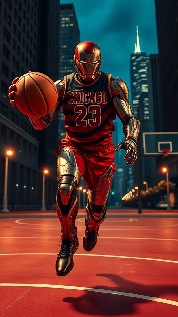 Ironman, dressed in a Chicago Bulls uniform complete with jersey, is playing basketball on an outdoor urban court. The scene captures a hyper-realistic perspective with graphics reminiscent of an Xbox 360 game, blending surreal realism and emotive realism. The atmosphere is vividly detailed, with Ironman's metallic suit gleaming under ambient street lights as he maneuvers with agility and precision. The iconic Chicago skyline looms in the background, casting an eerily realistic aura over the scene. The focus is on the juxtaposition of his high-tech armor and the classic aesthetics of a traditional basketball setup, emphasizing his intense concentration and dynamic athleticism.