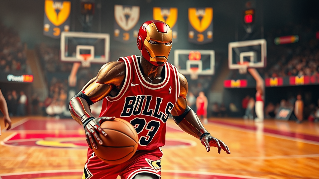Ironman in a Chicago Bulls uniform dribbles a basketball on a vibrant court, the jersey emblazoned with the iconic Bulls logo. The scene has a surreal realism, with Xbox 360 style graphics capturing every metallic sheen and fabric fold in exquisite detail. The emotive realism is palpable; Ironman's determined expression contrasts the playful energy of the game. The atmosphere feels both exciting and eerily realistic, as if capturing a moment suspended between reality and imagination on a 9:16 canvas.