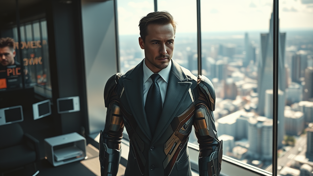 Ironman in a sleek, modern office, surrounded by futuristic technology, his armor incorporated into a tailored business suit, exuding confidence as dramatic light casts sharp shadows, symbolizing power and innovation, his eyes focused and determined, overlooking a bustling cityscape.