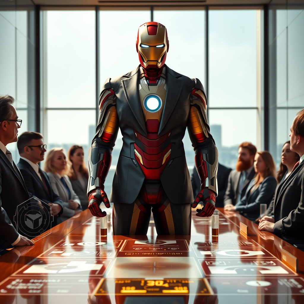 Ironman in a sleek, tailored business suit stands confidently at the helm of a modern, glass-walled boardroom, sunlight streaming through the floor-to-ceiling windows casting dramatic shadows across his face. His arc reactor subtly glows beneath the crisp shirt, a nod to his innovative spirit. Around him, a team of captivated executives listen intently, their expressions a mix of awe and determination, as he strategizes on groundbreaking projects. The room is filled with cutting-edge technology, including interactive holographic displays outlining futuristic business plans. Despite the corporate setting, there's an underlying tension hinting at the power and responsibility he balances as both a genius inventor and a savvy entrepreneur.
