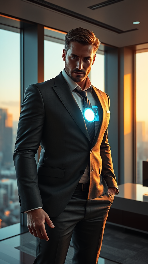 Ironman in a tailored business suit stands confidently in a sleek, modern office, surrounded by large windows overlooking a bustling cityscape. The room is filled with warm, dramatic light casting long shadows, accentuating his determined expression as his eyes focus on a digital hologram displaying financial graphs. His arc reactor glows faintly under the crisp white shirt, a subtle reminder of his technological prowess. The elegant decor reflects his impeccable taste, with high-tech gadgets discreetly integrated into the minimalistic design, symbolizing a perfect blend of innovation and sophistication.