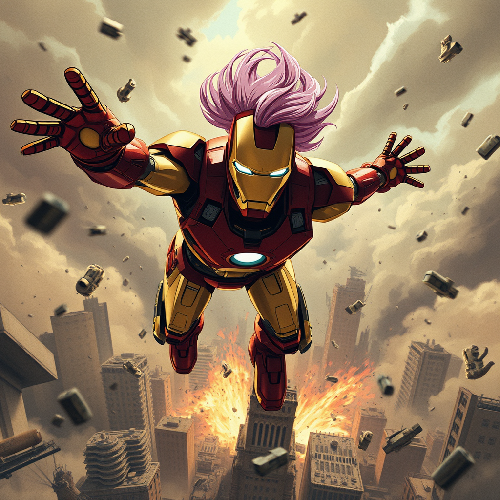 Ironman mid-air in a dynamic and intense scene, surrounded by chaos, the city in ruins below, captured in an 8k UHD photo with soft lighting, showcasing high quality and fine film grain, inspired by Fujifilm XT3. A vivid 3D illustration blending sepia tones with elements of painting, cartoons, and sketches, creating a visually striking composition. Despite imperfections like abstract anatomy and exaggerated features, the scene maintains its dramatic flair with Ironman's pink, windswept hair adding a unique twist. The image has an analog feel, reminiscent of old photographs, with parts intriguingly out of frame.