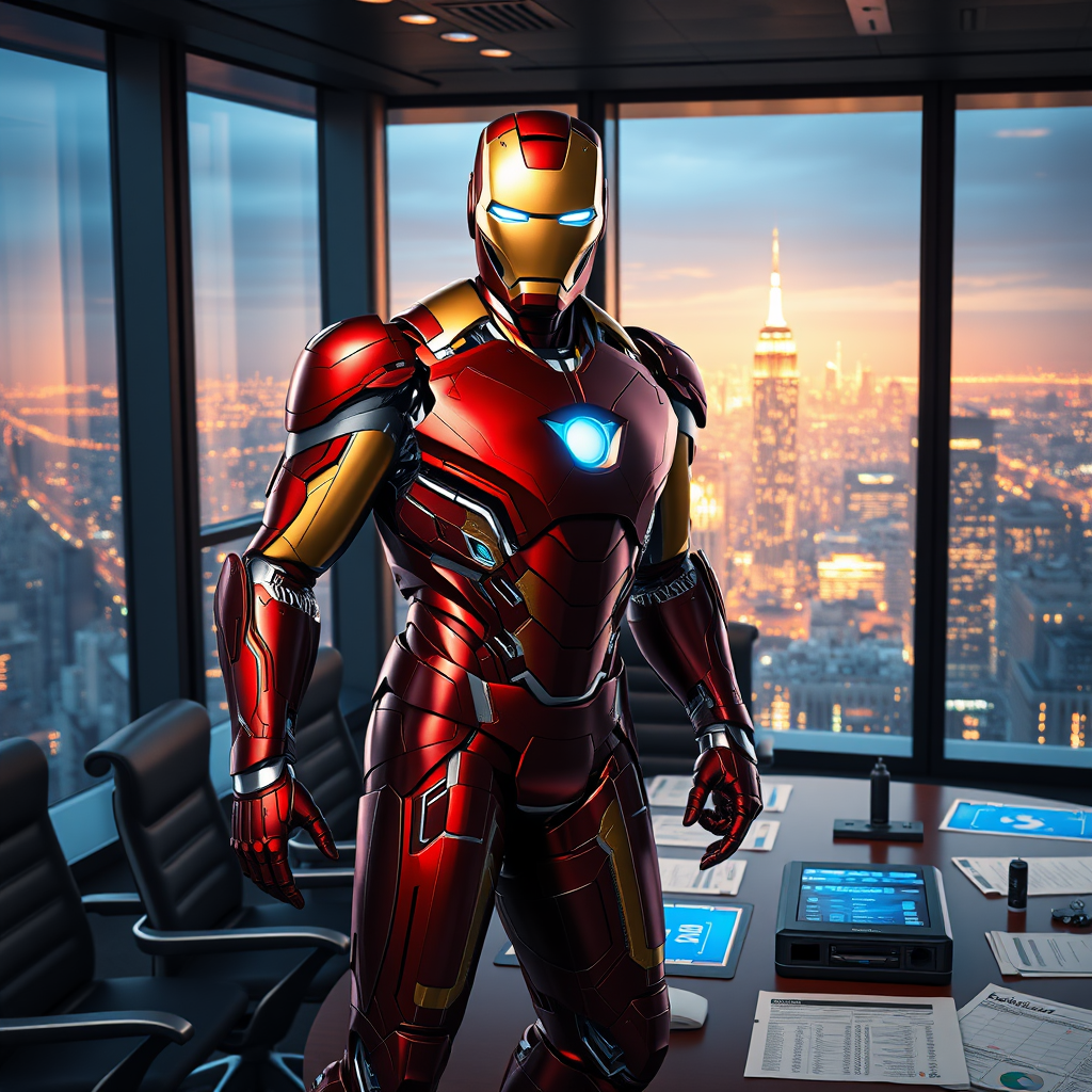 Ironman stands confidently in a high-rise office, dressed in a sleek, custom-tailored business suit that echoes the design elements of his iconic armor. The room is illuminated by dramatic city lights streaming through floor-to-ceiling windows, casting intricate shadows that highlight his determined expression. A vast boardroom table with holographic displays is scattered with cutting-edge technology prototypes and financial documents. In the background, the glowing skyline of a bustling metropolis signifies his dual role as a hero and a formidable entrepreneur.