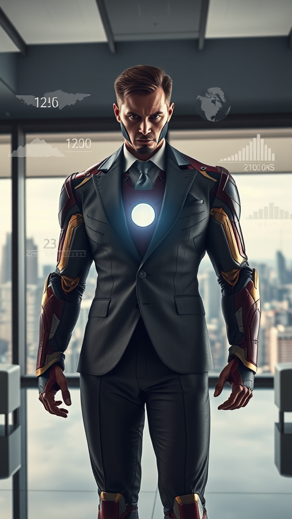 Ironman stands in a sleek, minimalist office, the skyline of a bustling city visible through floor-to-ceiling windows behind him. He's dressed in a sophisticated business suit with subtle hints of his iconic armor integrated into the design, suggesting both power and elegance. His signature arc reactor glows faintly through the tailored fabric, a reminder of his dual identity. Dramatic lighting casts sharp shadows across his determined face and the polished surfaces around him, highlighting his intense focus as he examines various holographic projections of global markets and technological innovations. This fusion of superhero and CEO embodies a man driven by ambition and responsibility, ever ready to conquer the business world with the same resolve he brings to heroics.