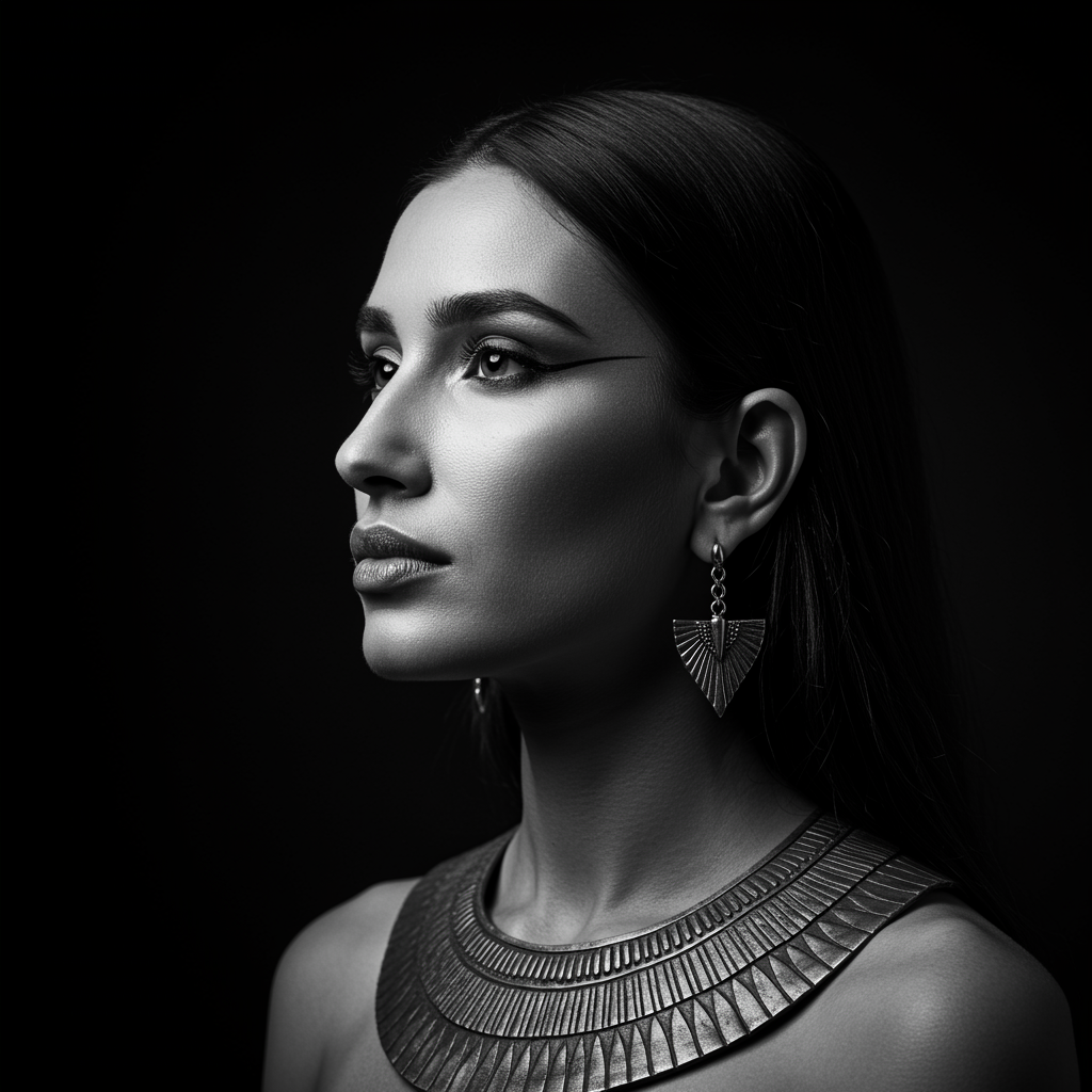 Isis goddess of Egypt 5 Premium Portrait Photography 4 well-lit, sharp-focus, high-resolution, creative, distinct, acclaimed photograph, Canon EOS 5D Mark IV DSLR, f/8, ISO 100, 1/250 second, close-up, natural lighting, professional, flattering, portrait, glibatree style 3 black and white, textured, abstract, no watermark -2.