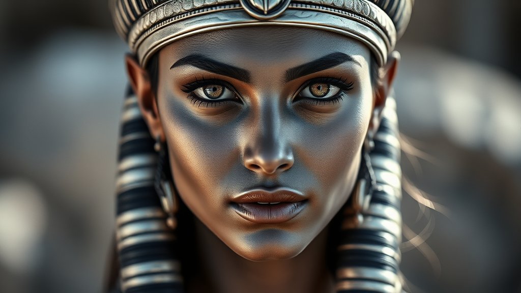 Isis goddess of Egypt inspired premium portrait photography well-lit sharp-focus high-quality artistic unique captivating image captured using Canon EOS 5D Mark IV DSLR settings f/8 ISO 100 1/250 second close-up with natural light professional and flattering headshot executed in glibatree style vibrant and detailed avoiding black and white graininess deformation or watermarks ensuring an elegant and timeless portrayal.