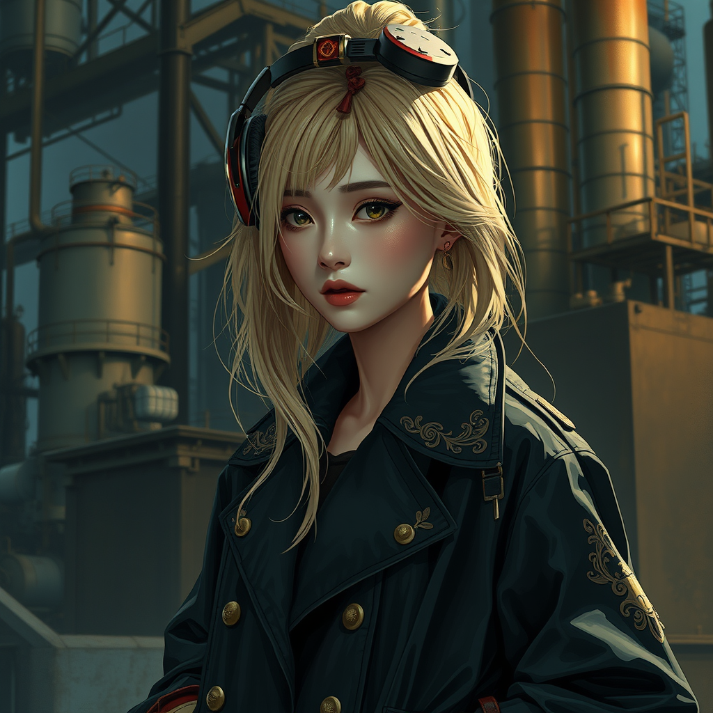 ISO 100 in an open imperial raincoat with intricate decor, featuring loose blonde hair in a dieselpunk style. An aristocratic presence with a stunning face, set against the backdrop of a diesel plant. The scene embodies retro-futuristic and social art elements with maximum detail in a vintage, hyper-realistic digital painting. Dark colors accentuate the complex details and intricate illustration, capturing a side view with light from multiple sources. A slender girl embodying an imperial-style officer, her photorealistic loose blonde hair frames a captivating face with Korean makeup. It's a masterpiece in dieselpunk style with retro-futuristic influences. The detailed depiction is rich with maximum realism, incorporating digital painting's finest intricacies. Hands-in-pockets, a piercing gaze, and headphones resting on a head adorned with a headdress. Hair elegantly tied in a bun, all captured in a side view with varied light sources, creating a vivid and detailed narrative.