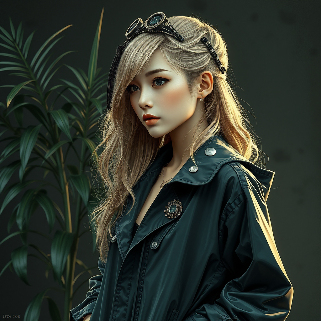 ISO 100 retro-futuristic portrait featuring a slender woman in an open imperial-style raincoat with intricate decor. Her loose blonde hair, styled with photorealistic Korean makeup, frames a stunning face. In the background, a diesel punk-inspired plant adds a vintage yet futuristic flair to the scene. This digital painting, rich in dark tones and complex details, captures her in side view with multiple light sources enhancing the realism. She stands with hands in pockets, exuding aristocratic elegance, her head adorned with a headdress. Despite the maximal detail and hyperphotorealism, avoid any depiction of anatomical inaccuracies or distortions to maintain the integrity of this masterpiece.