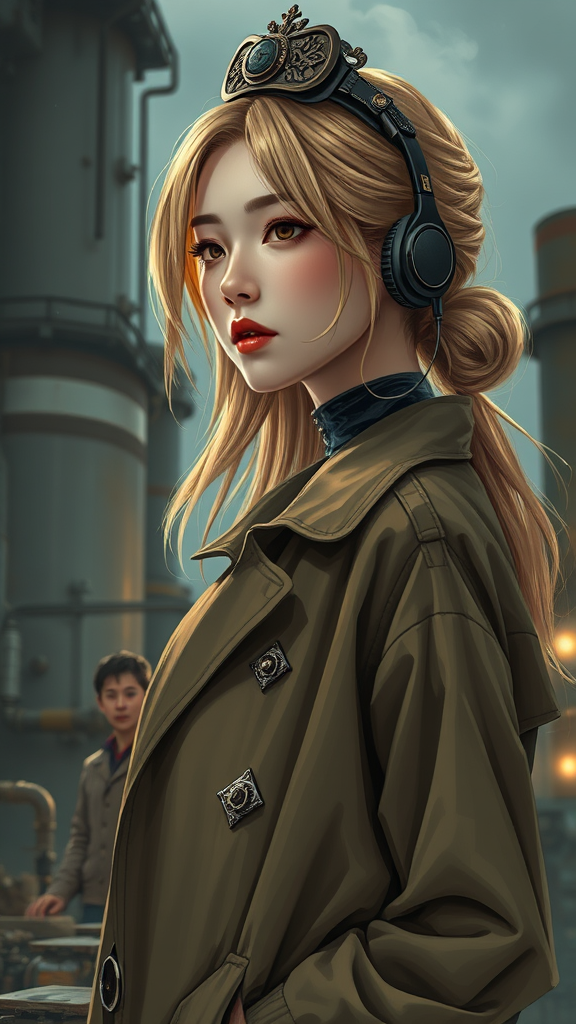 ISO 100 setting featuring a slender girl with loose blonde hair styled in a photo-realistic manner, wearing an imperial-style officer's open raincoat with intricate decor. Her stunning face exhibits a flawless Korean makeup style, set against the backdrop of a diesel plant in a vintage dieselpunk theme that merges retro-futuristic and social art elements. The digital painting emphasizes hyper-realism with maximum detail and dark color palettes, creating a complex, detailed illustration from a side view perspective. Multiple light sources create dynamic highlights, enhancing the overall realism. Creative elements include a headdress, hands in pockets, and headphones. The visual maintains artistic integrity without distortion, focusing on seamless anatomy and a single well-composed figure.