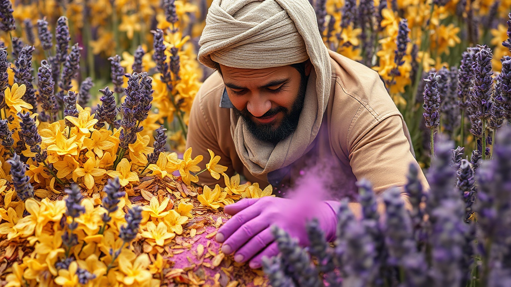 Italian harvest worker amidst golden jasmine tea leaves and purple lavender tea dust.