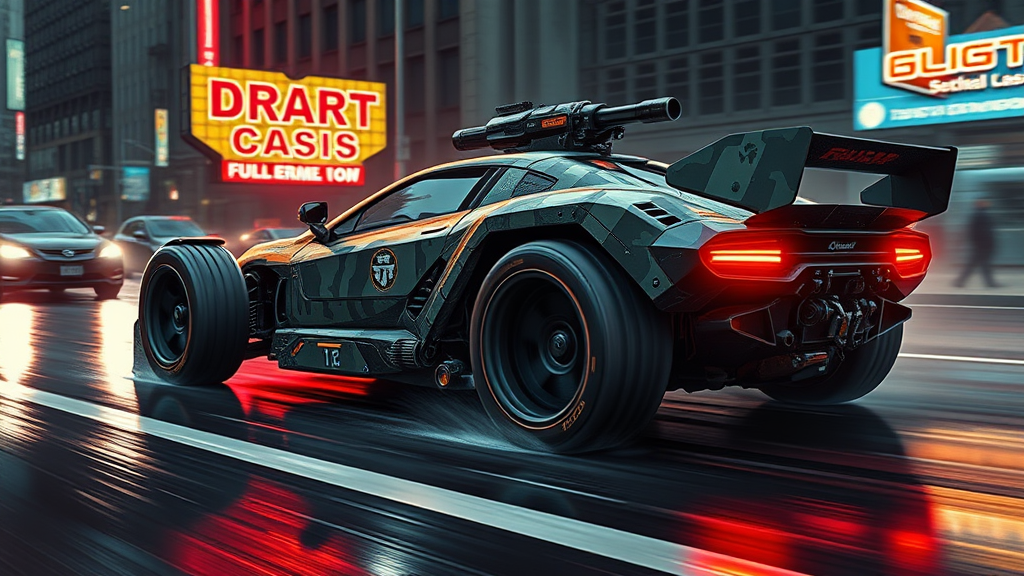 itrobo2022 futuristic combat vehicle, military decals on the car, focus on full vehicle design, equipped with a large cannon, high speed chase, cinematic action scene, slick wet roads, set in an illegal racing environment, dark atmospheric mood, cyberpunk aesthetics reminiscent of Blade Runner, designed as cover art, showcasing a detailed and intricate view of the battle car, rendered in digital painting, concept art style featured on artstation, smooth lines with sharp focus in illustration, created using affinity photo, available in 4k and 8k resolution.