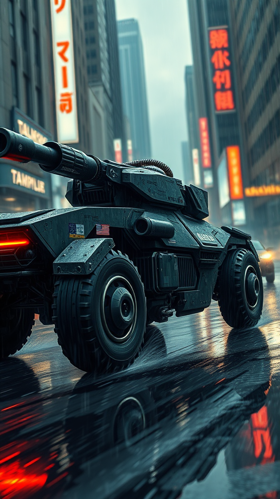 itrobo2022 futuristic combat vehicle military decals sleek design powerful cannon dynamic speed thrilling movie chase scene rainy urban street underground racing game intense moody setting cyberpunk vibes reminiscent of blade runner cinematic style cover illustration full view of high-tech battle vehicle intricately detailed digital painting concept art featured on artstation affinity photo ultra-high-definition visual clarity 4k 8k smooth sharp detailed illustration
