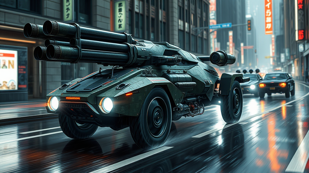 itrobo2022 futuristic combat vehicle military-themed detailing sleek design equipped with massive artillery high-velocity chase cinematic action scene slick rain-soaked streets underground racing aesthetics moody and shadowy ambience cybernetic edge inspired by blade runner highly detailed concept art digital render artstation quality intricately crafted smooth and sharp illustration affinity photo resolution in 4k and 8k full perspective view of battle vehicle