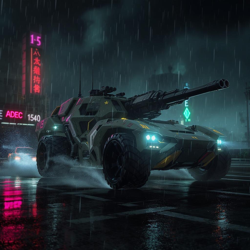 itrobo2022 futuristic combat vehicle, sleek military graphics on robust design, full vehicle display, equipped with enormous artillery, high velocity, action-packed cinematic chase, gleaming wet streets, outlaw racing ambiance, shadowy and intense atmosphere, cyberpunk-inspired, echoes of Blade Runner aesthetic, dramatic cover illustration, complete view of an armored machine, complex and meticulously detailed, crafted digital artwork, artstation style, concept visualization, clarity in detail, vivid focus, crafted in Affinity Photo, rendered in 4k and 8k resolution.