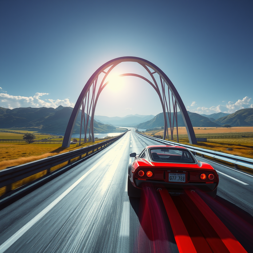 Itβs summer. The highway stretches across an open field and ascends onto the Arched Bridge over a gentle river. The lead racing car starts to climb the bridge. A shock! A chasm in the highway! There are no alternative bridges in sight. Ahead of the lead car looms a massive pit. Beyond the bridge, the continuation of the track is obscured. The camera watches from behind and slightly to the side of the car. Sunlight bathes the raceway in vivid illumination. The scene is set in a vibrant cyberpunk style, where neon hues and futuristic elements cast an otherworldly glow over the landscape.