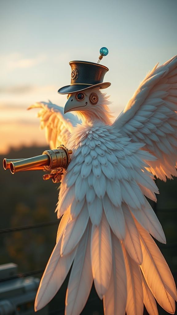 Ivory-hued feathers intricately etched with copper filigree glistened in the fading sunlight as the aeromancer's talon-forearm jack bolted into a gearwork scaffold. Twin brass cannons nestled in her winglets shone like polished opals, their rifled barrels adorned with tiny gears and dials that glinted like moonstones. A dorsal fin carved from polished steel soared above her shoulders, hosting a delicate azure glass vial that pulsed with a faint astrological glow. A miniature top hat of burnished bronze clung precariously to her skull, its silk-lined interior rumpled from her recent acrobatic exploits.
