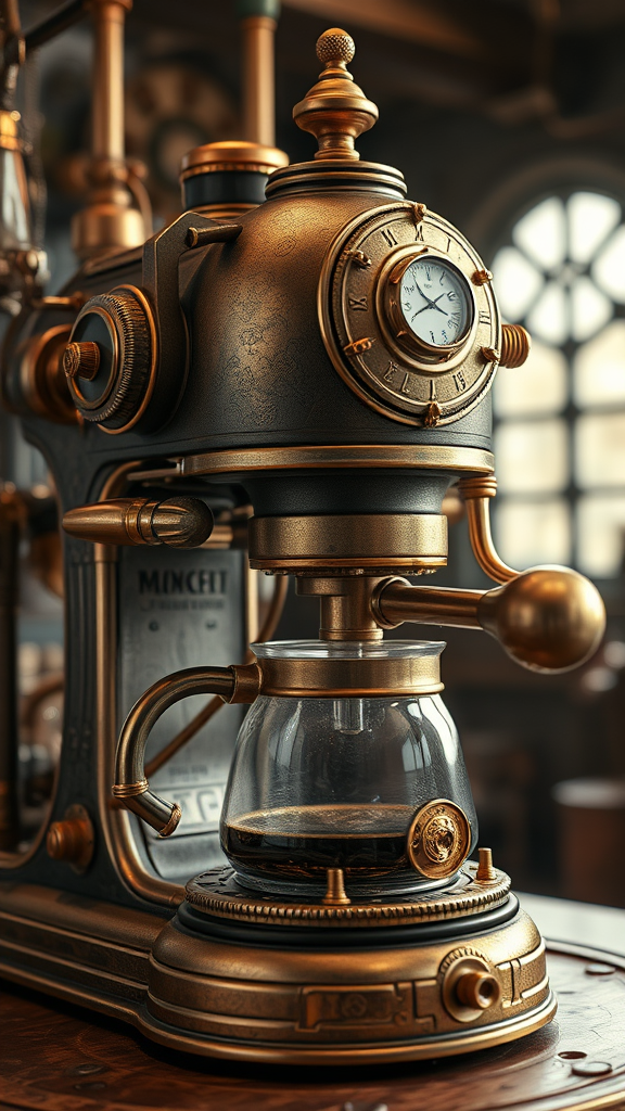 IvoryGoldAI creation of a steampunk coffee machine, showcasing extreme detail with intricate and ornate design elements. Capture this in 16k resolution with UHD and HDR qualities for hyperrealistic and photorealistic effects. The analog style emphasizes detailed skin and pores, with matte textures softened by subtle lighting. Realistic shadows and subsurface scattering highlight the beauty of the golden ratio in this masterpiece. The composition reflects film photography standards with soft focus and high detail, avoiding distractions like watermarks, logos, or text. Ensure artistic purity by maintaining proper anatomy, proportions, and excluding any out-of-frame elements. This visually stunning piece epitomizes ultra-realism in both form and aesthetic.