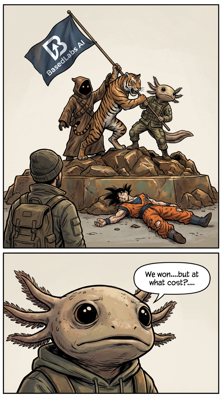 the iwo jima memorial bronze statue but instead the soldiers are a jawa, a tiger, and an axolotl, and they stand atop a defeated goku and raise a flag with a BasedLabs AI symbol on it, in the foreground is the back of an axolotl in civilian clothes looking at the memorial statue. second panel close-up of the axolotl who has large round black eyes and a cute face, with speech bubble, "We won....but at what cost?...."