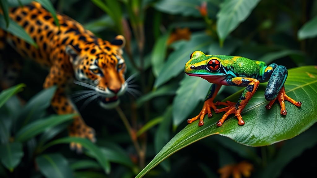 Jaguar prowling through lush rainforest, vivid poison dart frog perched on a leaf, captured with a Canon EOS Rebel SL2, equipped with EF100mm lens, f/3.5, Macro IS USM, 100.0 mm, 1/800 120, vibrant colors and intricate details in harmony.